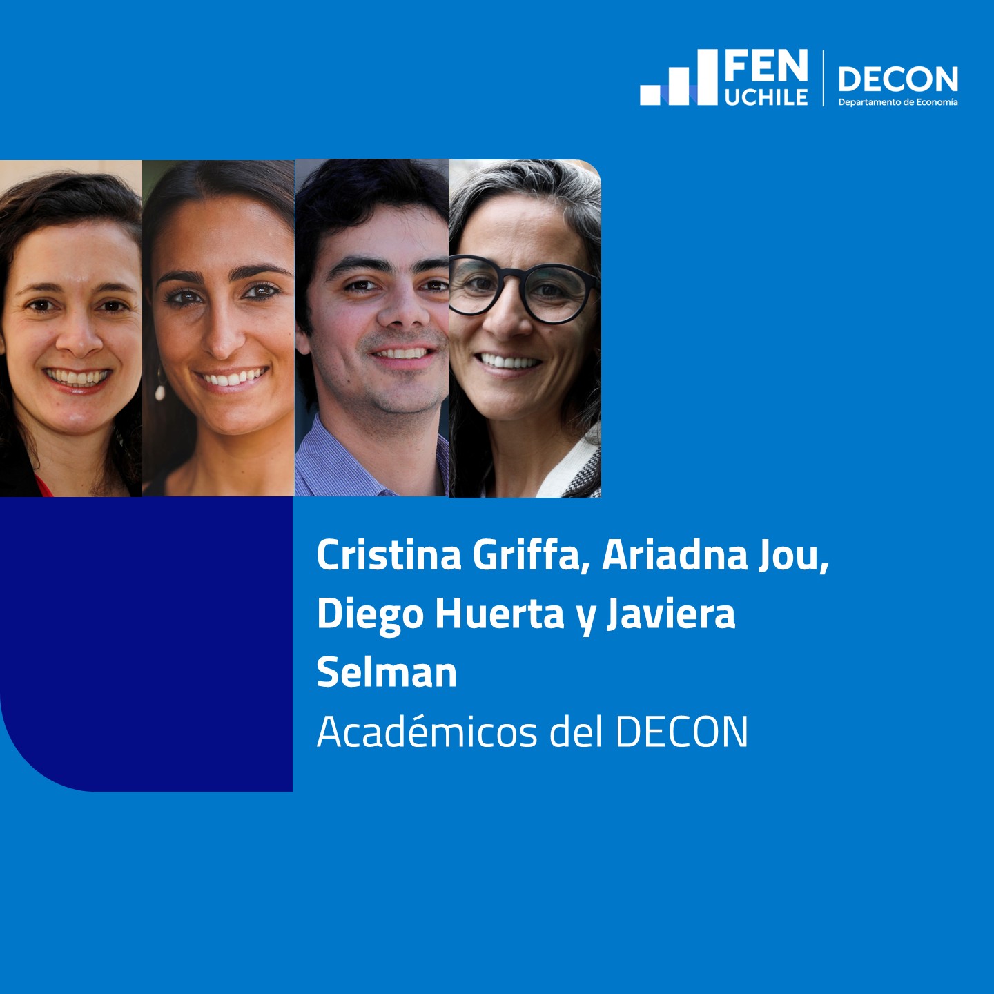 El Departamento de Economía de la Facultad de Economía y Negocios (FEN) de la Universidad de Chile celebra un nuevo logro en su trayectoria de investigación. Recientemente, la ANID publicó los nombres de los académicos seleccionados cuyas investigaciones serán financiadas por el Fondo Nacional de Desarrollo Científico y Tecnológico (Fondecyt) de Iniciación correspondiente a 2026. Los cuatro académicos de nuestro departamento que resultaron seleccionados son Cristina Griffa, Ariadna Jou, Diego Huerta y Javiera Selman, quienes liderarán investigaciones de vanguardia en distintas áreas de la economía.