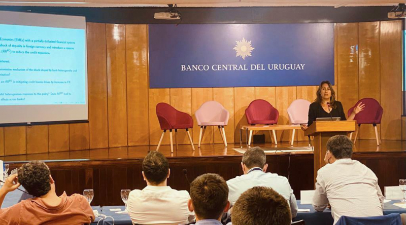 En esta oportunidad, la académica del DECON, Eugenia Andreasen, presentó el paper “Capital Flow Management Measures and Dollarization”, coautoreado con la académica Victoria Nuguer (ITAM/BID). Su trabajo estudia desde una perspectiva empírica y teórica los efectos sistémicos y a nivel bancario de imponer encajes obligatorios a los depósitos en moneda extranjera en una economía con un sistema financiero fuertemente dolarizado. Los resultados sugieren que el encaje es efectivo para reducir el nivel general de crédito en la economía y que la respuesta de los bancos en términos de crédito es heterogénea, dependiendo de su ratio de financiamiento externo ex-ante, es decir, la proporción de depósitos en dólares con respecto al total de préstamos.