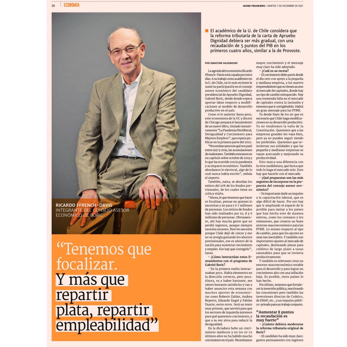 El economista del Departamento de Economía de la Universidad de Chile, Ricardo Ffrench-Davis, expone en esta entrevista publicada pocos días después de la primera vuelta presidencial por Diario Financiero, su visión de los desafíos económicos para el próximo Gobierno.